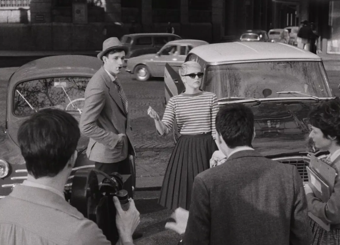 比如,戈达尔著名的即兴创作习惯被真实呈现:他常在拍摄当天清晨坐在咖啡馆,临时写下当天的对白。这种做法在今天看来充满浪漫色彩,但在当时却让剧组人心惶惶。茜宝作为好莱坞训练出的演员,难以适应这种毫无准备的拍摄方式;制片方则担心进度失控。