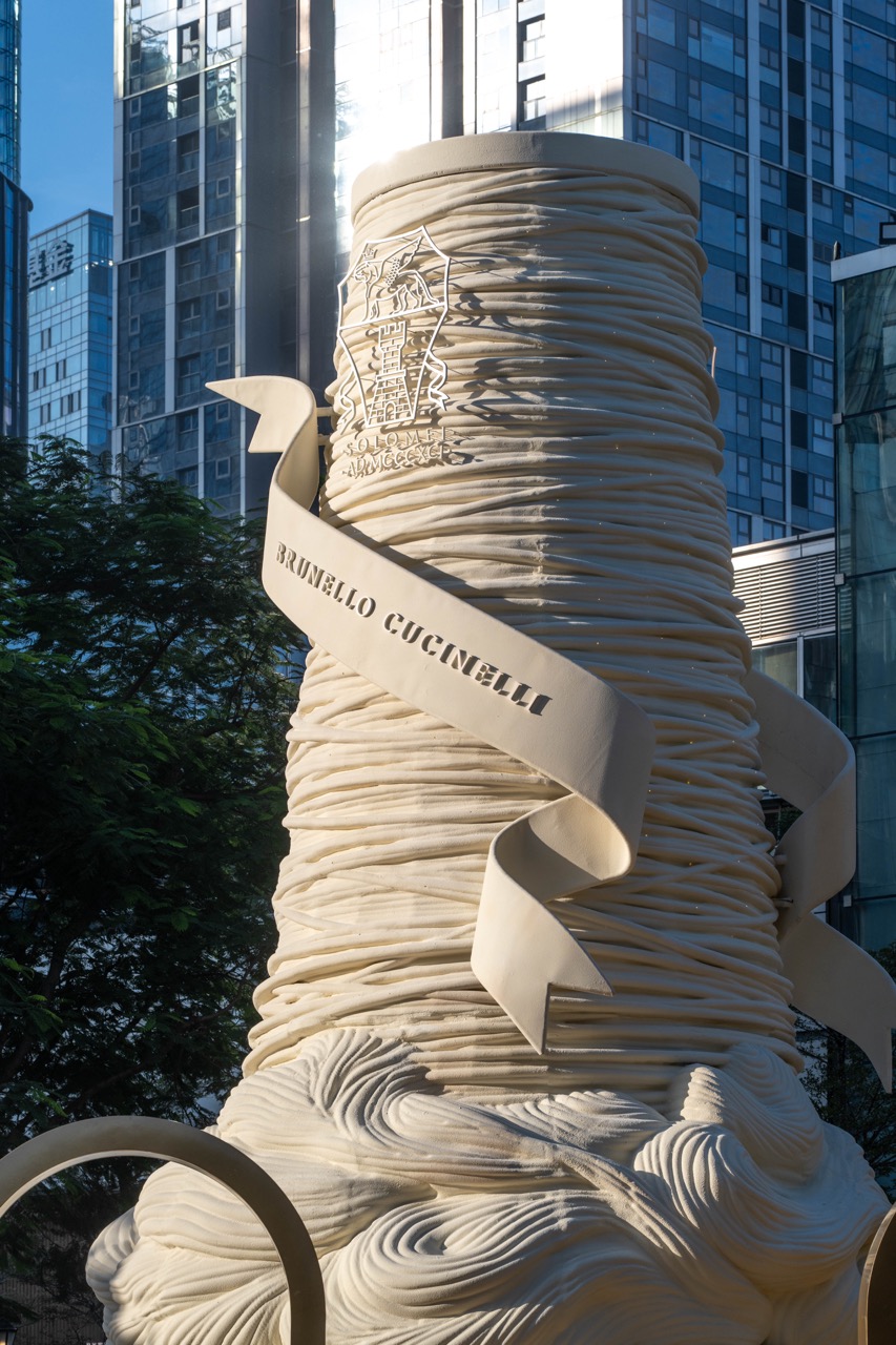 Brunello Cucinelli将冬日氛围直接搬到深圳湾万象城中央广场——高达十米的羊绒主题圣诞艺术装置作为核心视觉登场,以绒线与绒团构成立体羊绒圣树,顶部嵌入品牌标志性的狮鹫徽章,索罗梅奥小镇的人文意象被具象化为可进入、可观赏的城市装置。该冬日艺术装置将持续展出至20261月。