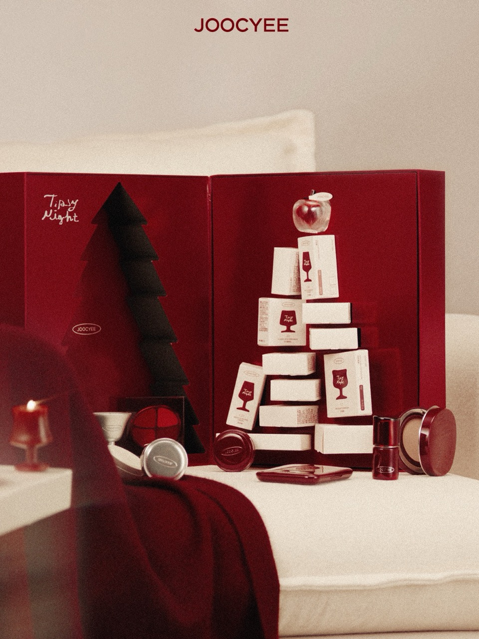 酵色JOOCYEE在年末节点推出的“正好微醺”节日限定系列,以“清醒与醉意之间的微醺时刻”为灵感,围绕唇、颊、眼、底妆构建出一套完整的氛围妆容体系。系列包含微醺唇颊冻与唇颊膏、水光润唇霜、灵感妆容盘、多用霜、四色眼影以及全新酒红气垫,从水光、绒雾到珍珠光泽三种质感并行推进,覆盖肉桂、红棕、玫瑰三大微醺色段。唇颊冻与膏主打高透水光与轻哑光晕染两种路线,强调贴肤感与氛围延展;气垫则以细腻珍珠光为卖点,兼顾通透妆效与肤质修饰。配套还推出可自由组合的小礼盒、三件套及ALL IN礼盒,将节日妆容、实用单品与仪式感一并打包。