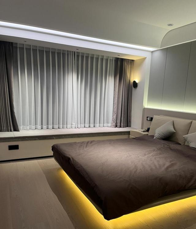同时,还可以考虑无床头的床、悬浮床脚等,这样能让房间看起来更宽敞,还能避免床脚带来的磕碰问题。