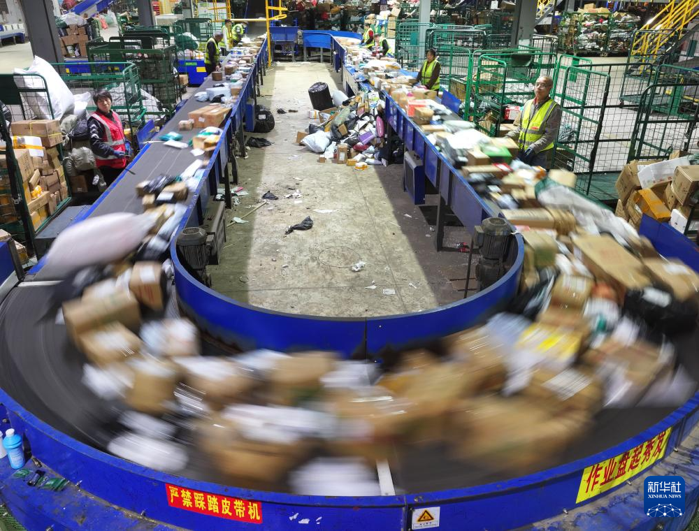 ▲11月5日,中国邮政集团有限公司衡阳邮区中心局邮件处理中心,工作人员在工作线上分拣快递包裹(无人机照片)。曹正平 摄/新华社