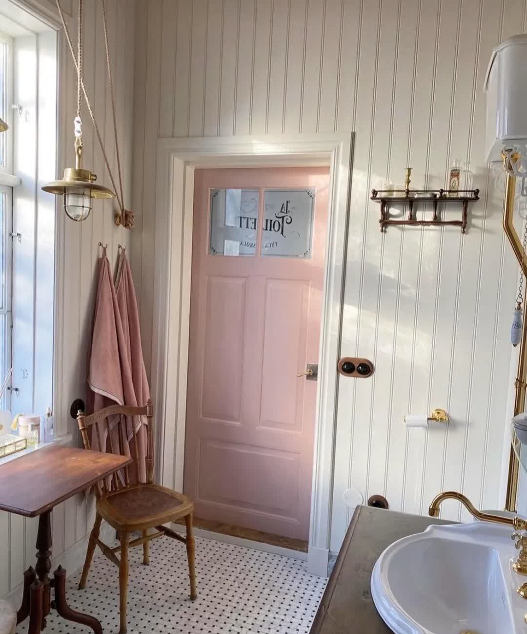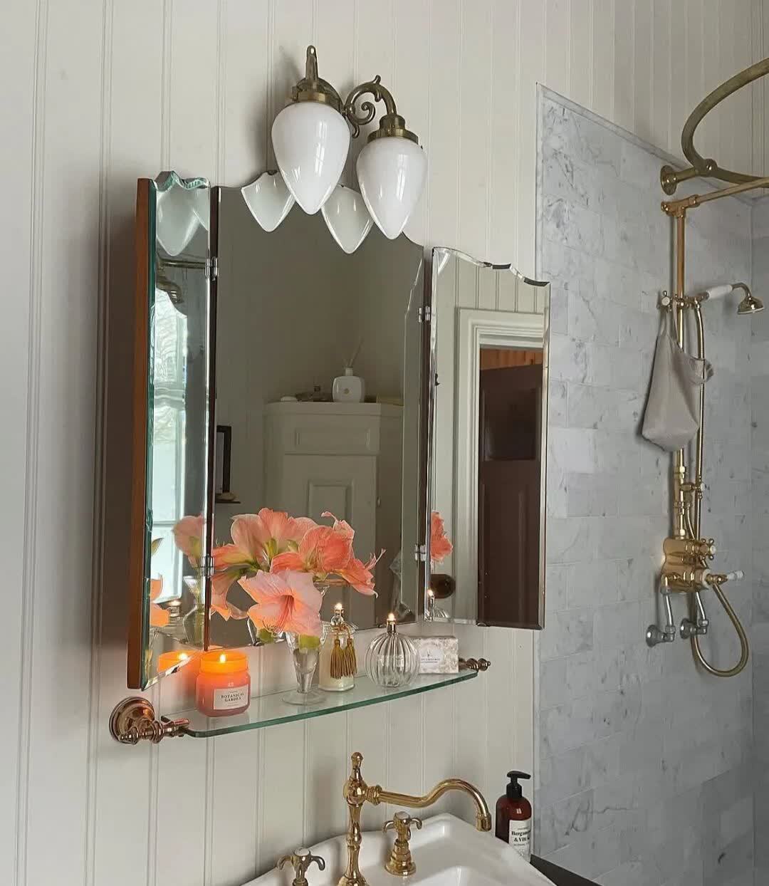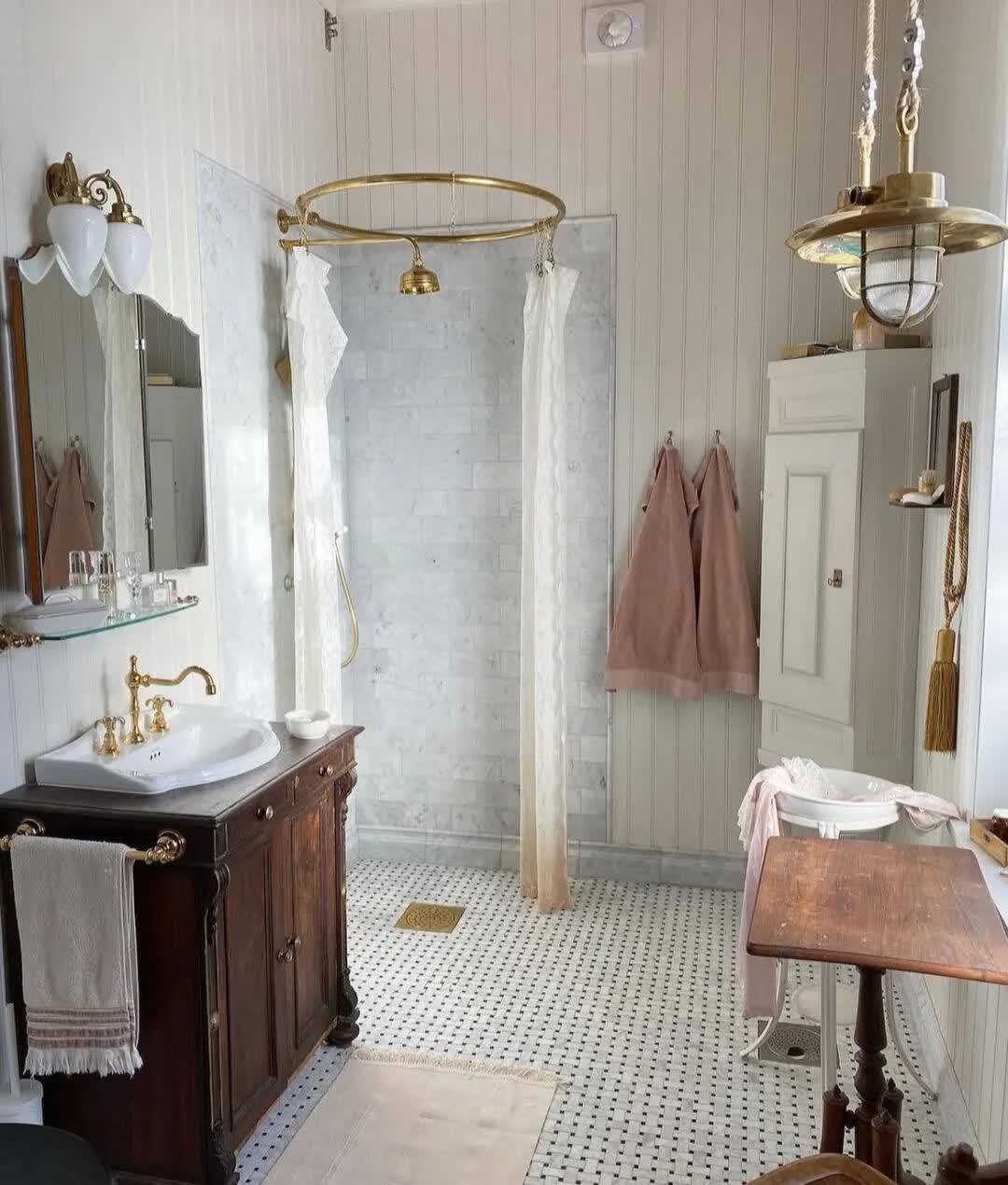 老房子的改造之路并不那么容易和简单,永远不会真正完成。它需要在生活中不断照顾,新项目旧项目一直都在进行。这个浴室式愿望清单里的一项,如今阳光已经可以来到浴室墙上,金色的五金,实木家具,让浴室有着复古且精致的细节,很漂亮。