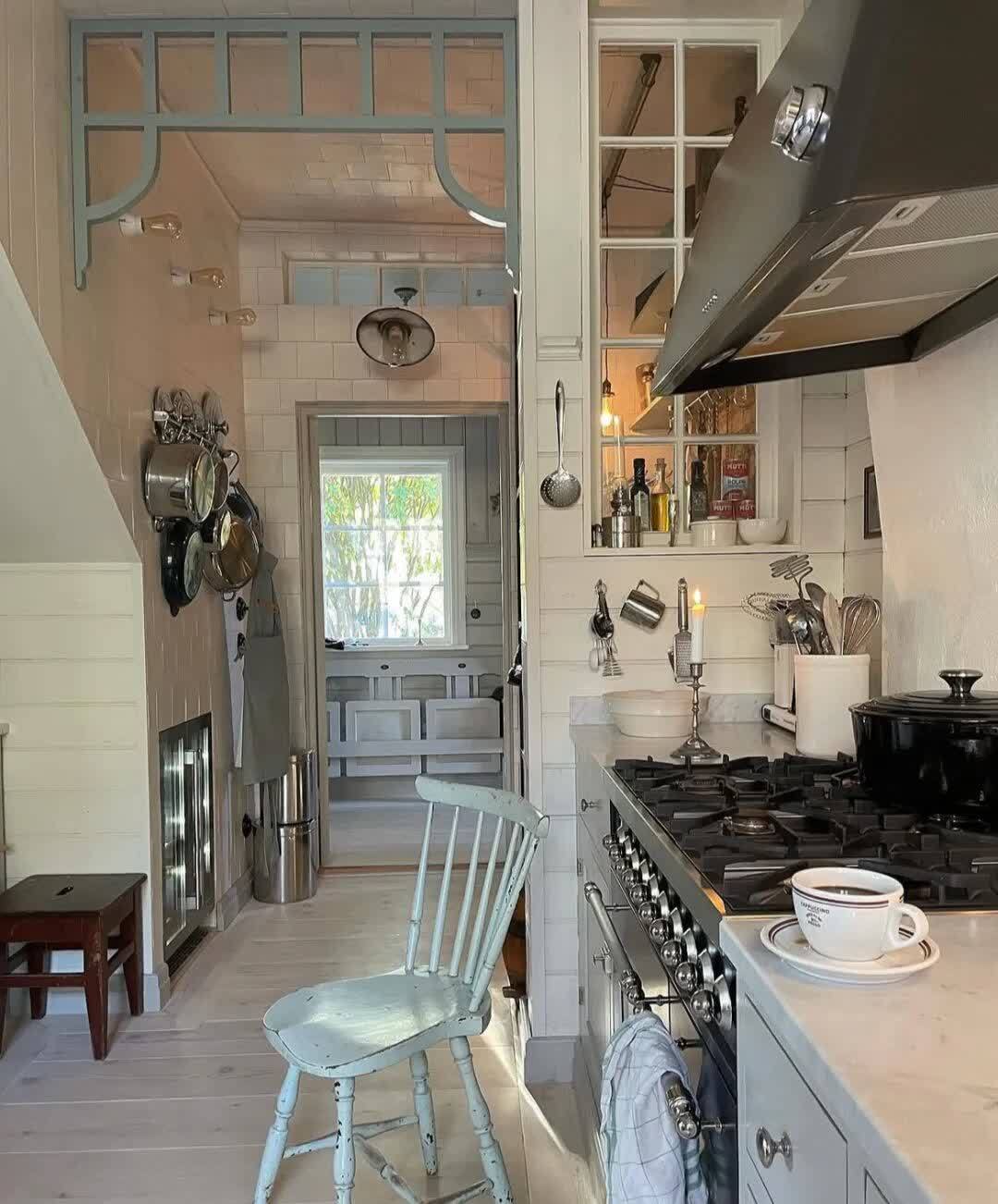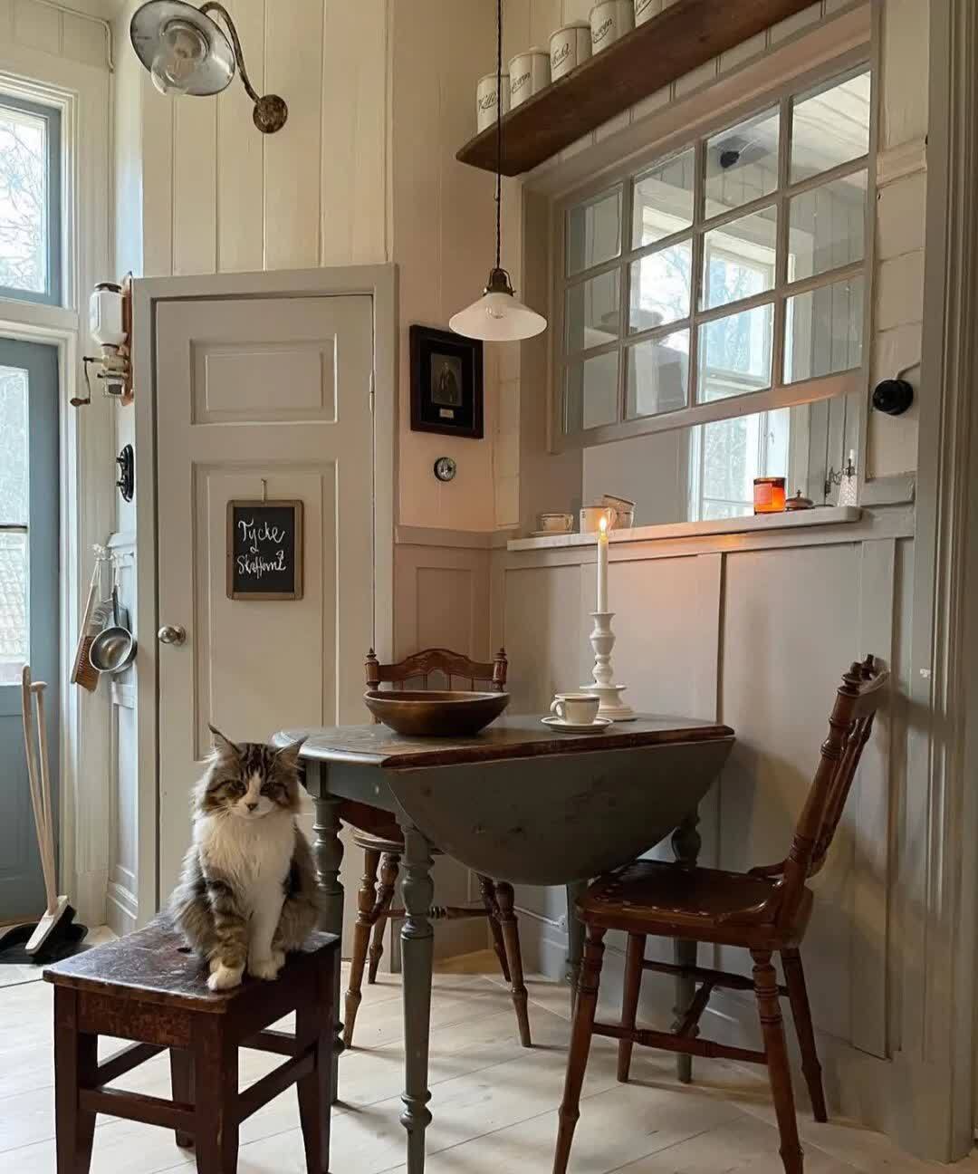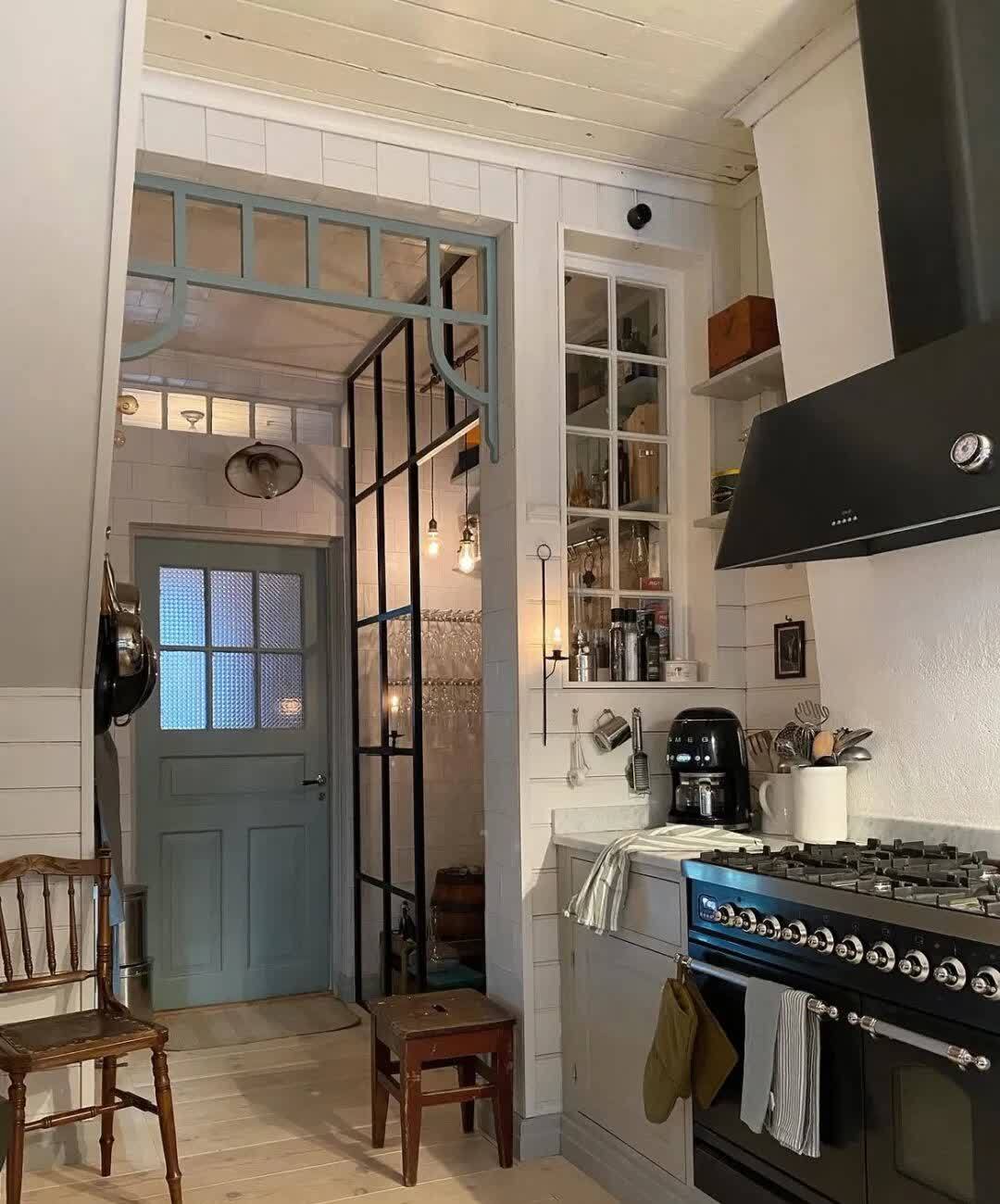 厨房是家中最重要的社交场所之一。早上厨房的咖啡休息时间是一天的黄金时刻,总是有猫咪陪伴,它是女主的三个“同事”之一。从跳蚤市场淘来的古董桌椅,搭配上热气腾腾的咖啡和面包,是那么的美好。