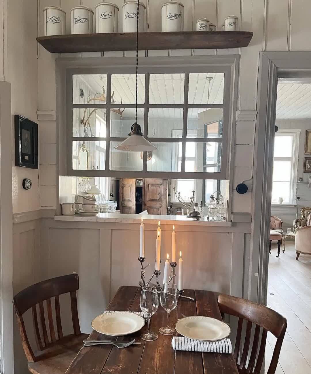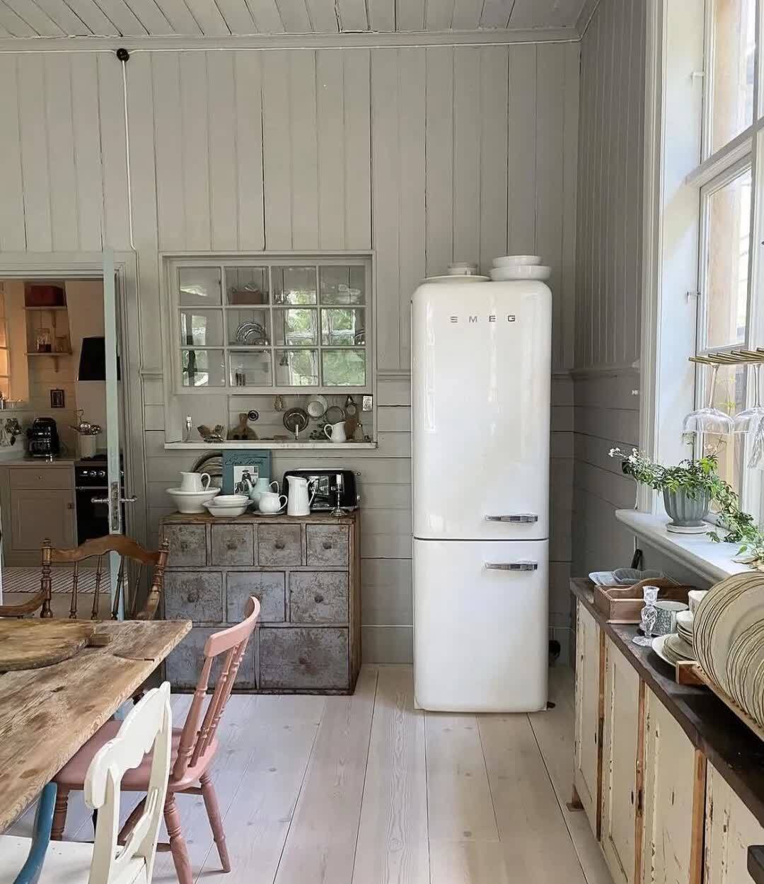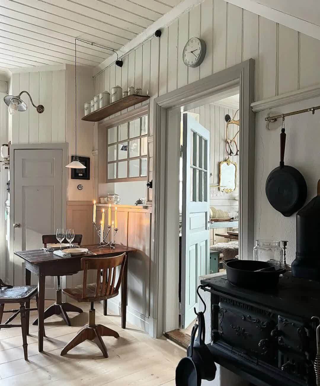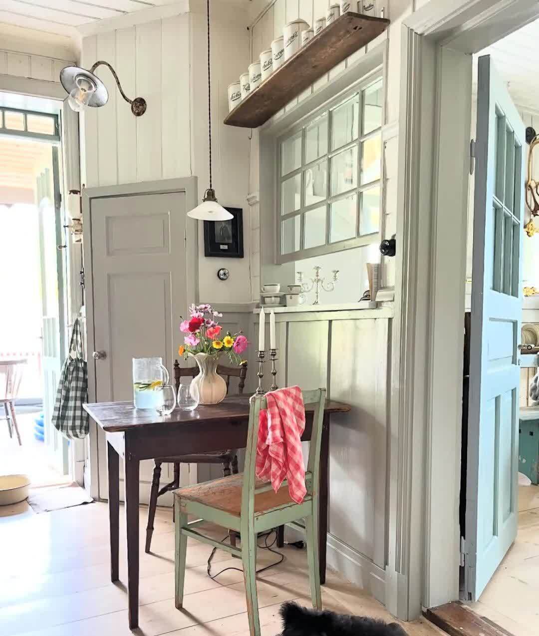 厨房是家中最重要的社交场所之一。早上厨房的咖啡休息时间是一天的黄金时刻,总是有猫咪陪伴,它是女主的三个“同事”之一。从跳蚤市场淘来的古董桌椅,搭配上热气腾腾的咖啡和面包,是那么的美好。