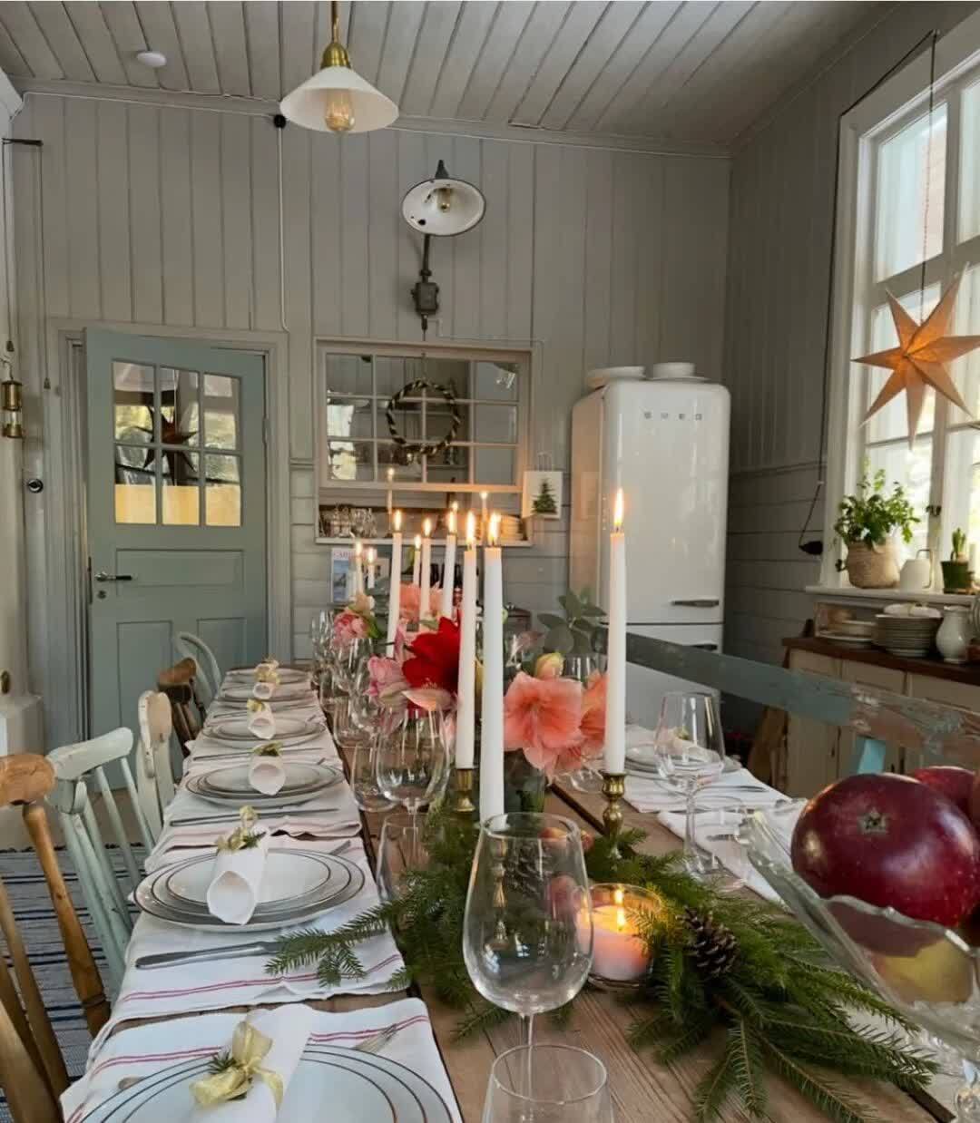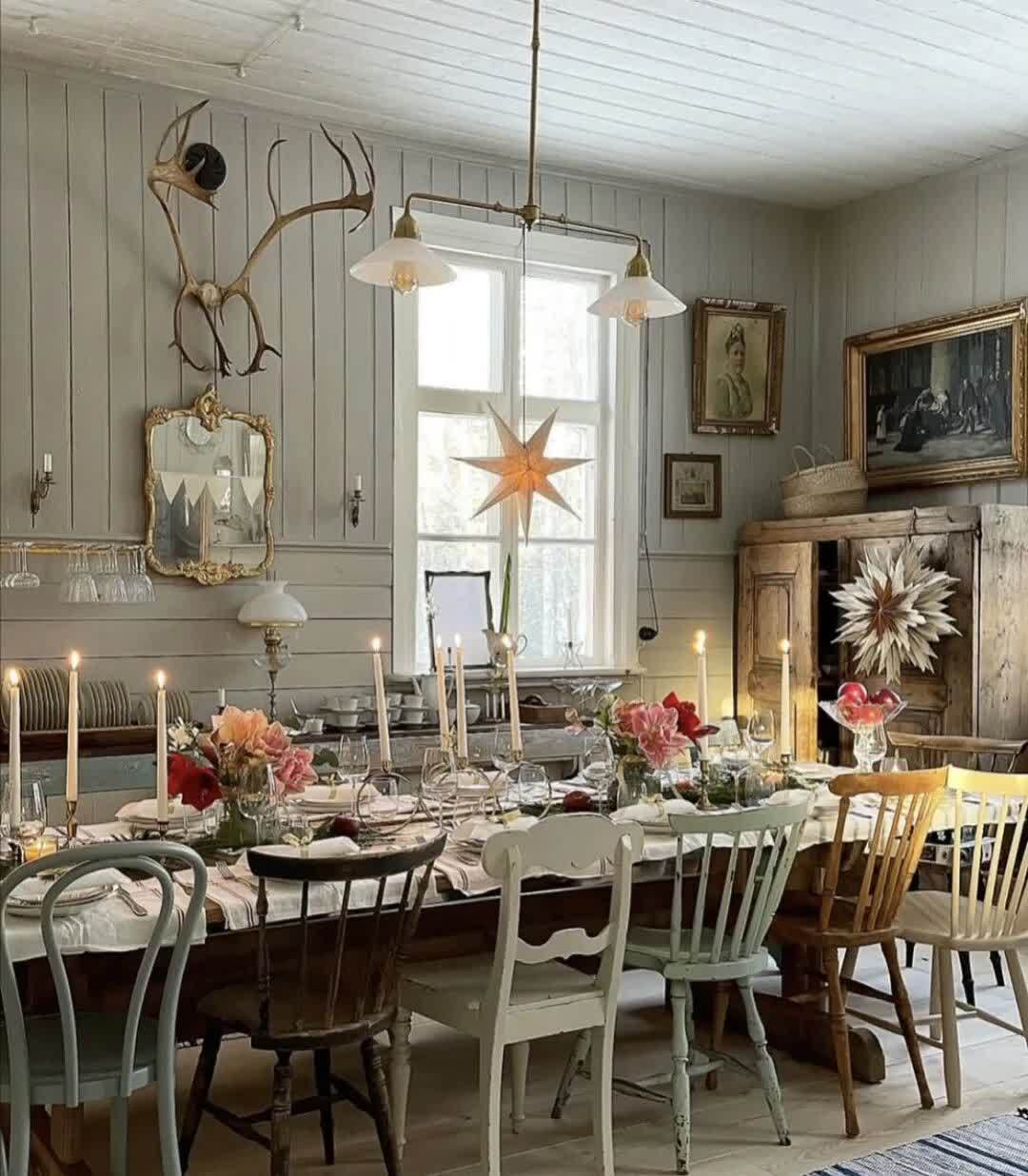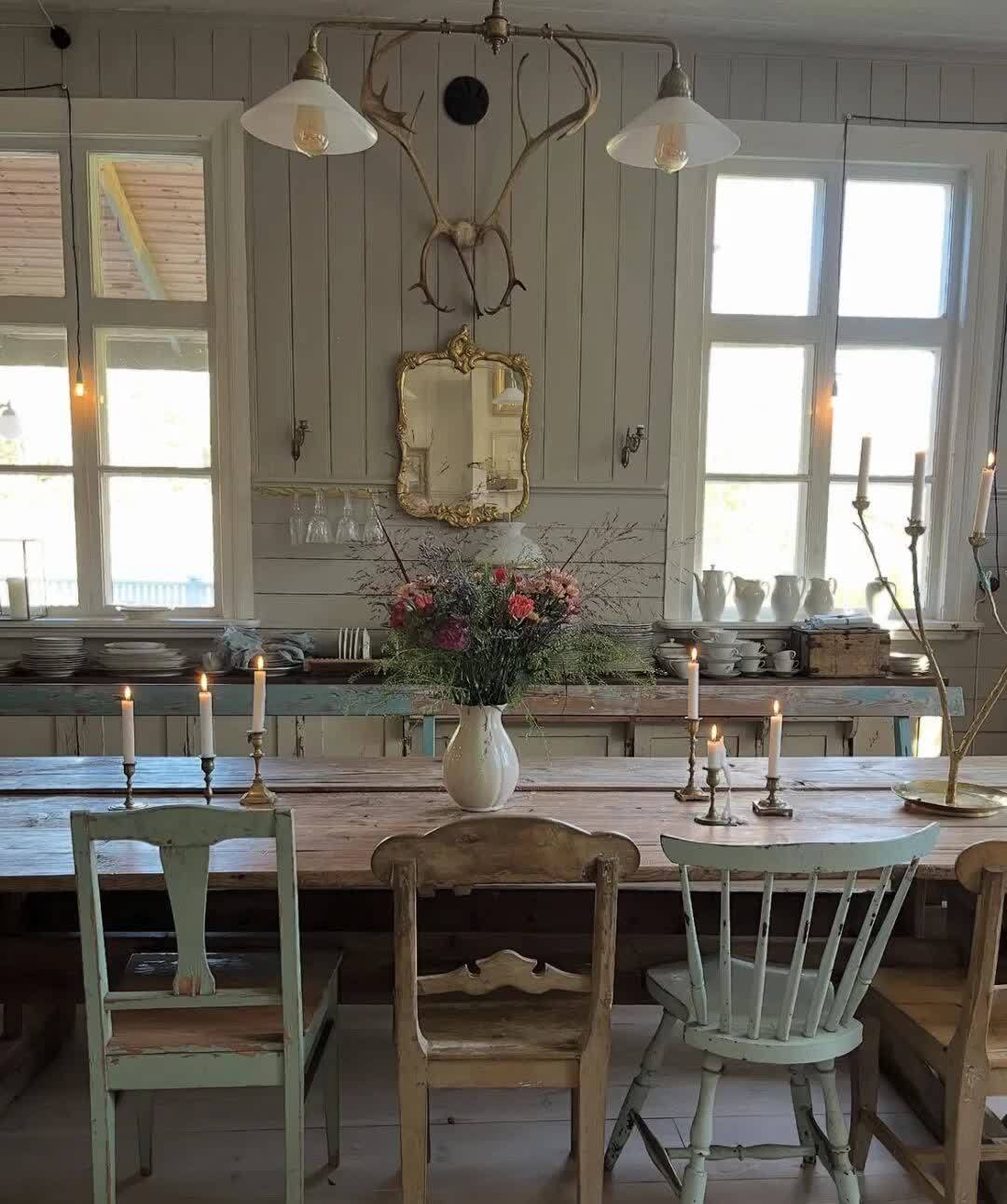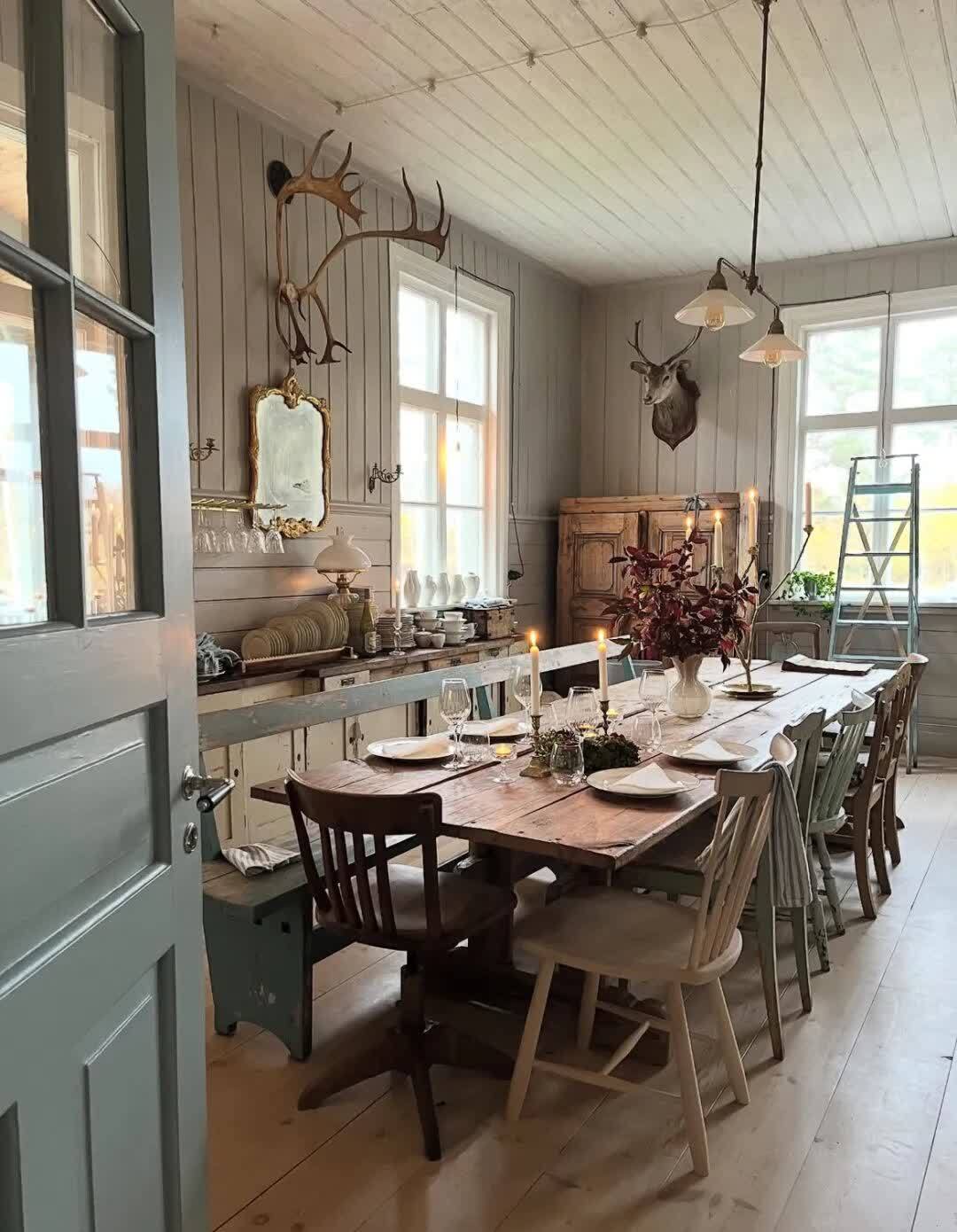 原本的学校大厅,变成了可以聚会的大餐厅。朴实无华的实木长桌,是这个房子里的首席,充满了生活、谈话和笑声。当节日来临,它就变成了装饰品,蜡烛、食物、瓷器和餐巾在暖光下闪耀,美妙、舒适且有趣。