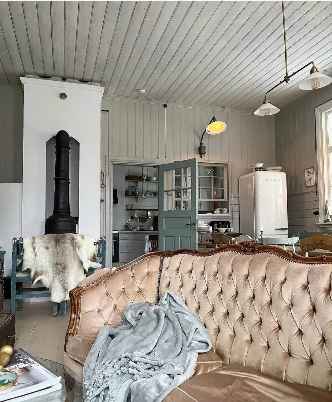 家人聚集的日子里,这个大房间里充满了节日的香气和燃烧的篝火。曾经为孩子提供温暖的壁炉,如今依然燃烧着森林里的桦木,带来舒适与温暖。一家人经常在寒冷季节里,坐在舒适的老式沙发上,看着电视陷入生活带来的美妙感觉之中。