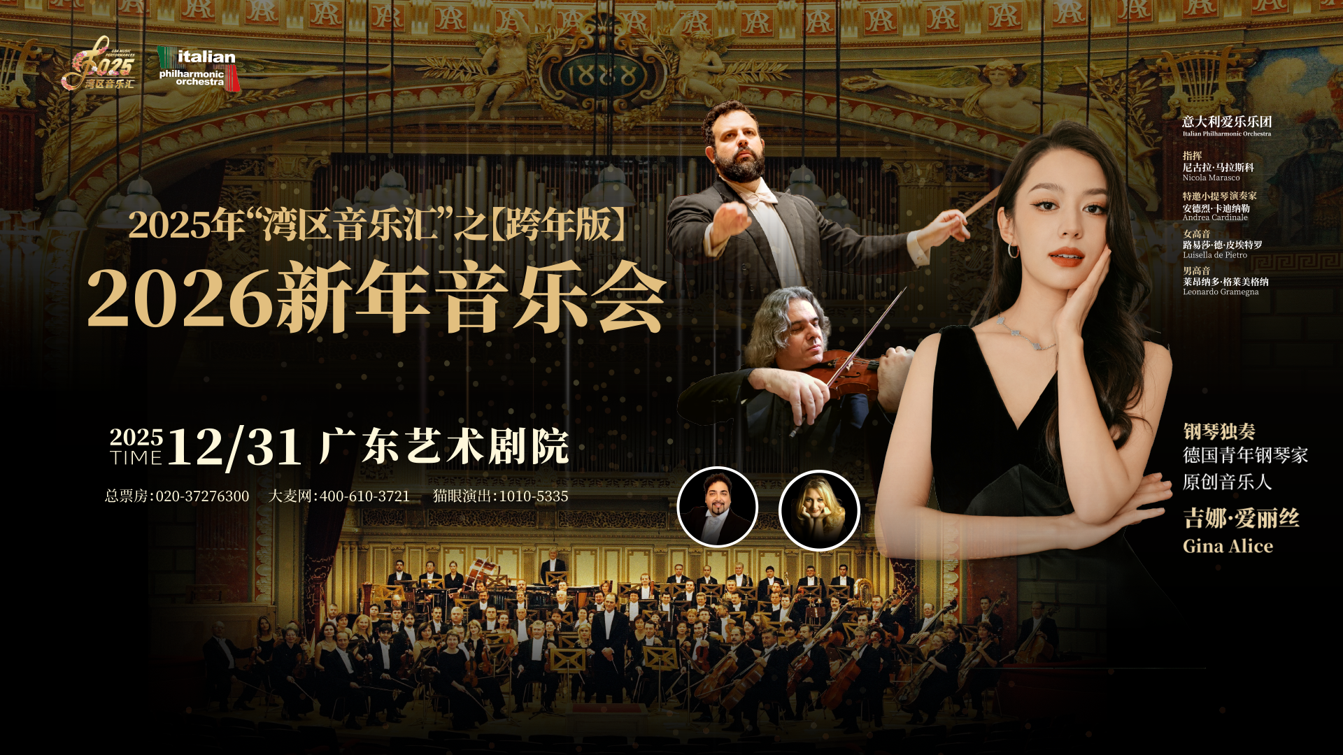 12月31日,“湾区音乐汇” 系列活动跨年压轴演出《2026新年音乐会》将于广州艺术剧院惊艳启幕。吉娜·爱丽丝首次登陆广州跨年舞台,与享誉世界的意大利爱乐乐团携手,用流淌的治愈旋律陪伴观众跨越零点,共度年末最值得奔赴的听觉盛宴。