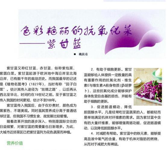 [1]姚扶有.色彩艳丽的抗氧化菜——紫甘蓝[J].绿化与生活,2013