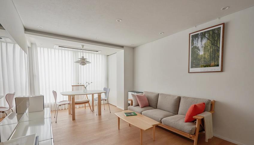 改造前的客厅是带了个小阳台,而改造后选择将其打通并入客厅扩大使用空间。