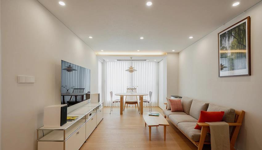 客厅整体采用白色和木调的现代风格,营造出温馨舒适的氛围,令人心旷神怡。不做吊顶,天花上装筒灯做无主灯设计,使空间看起来更加简约,使空间看起来更宽。