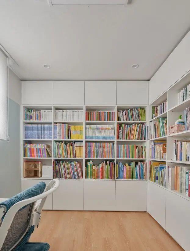 L型的书柜直接将这间书房装出了图书馆的既视感,琳琅满目,满屋的书香气。
