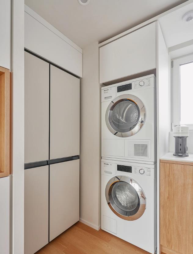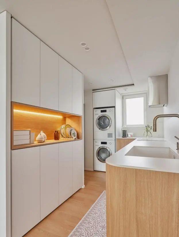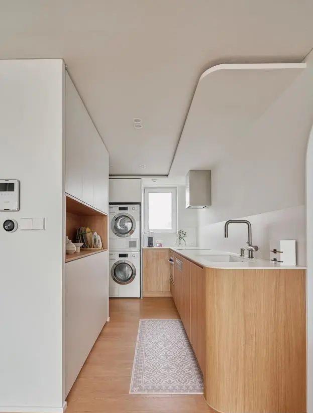 改造后打柜子将空间填补并利用起来,并且还将双开门的冰箱包进去,空间利用极致。