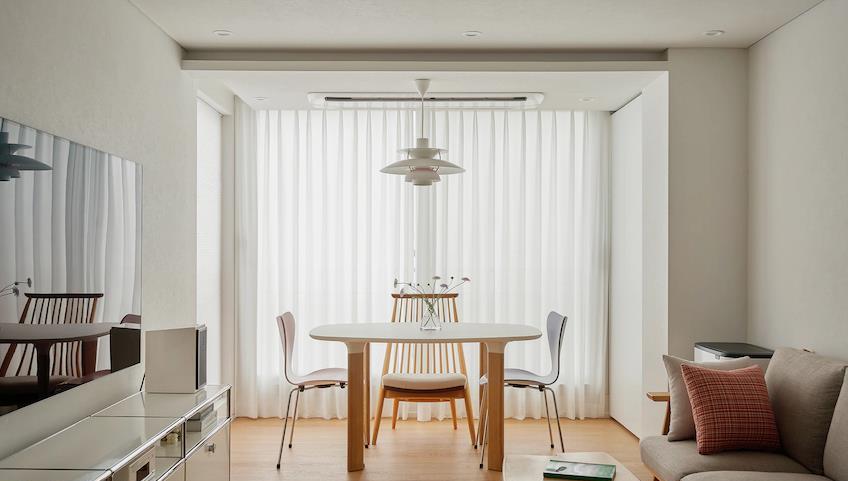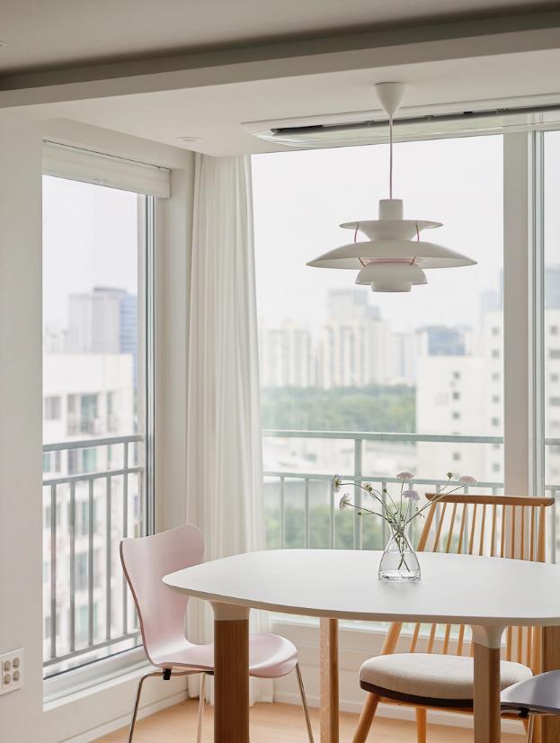想要一个宽敞点的厨房,所以改造后将餐厅和原始的厨房打通了,而如今的餐厅被安排在客厅,餐桌靠着窗摆放,在这里出了吃饭可以简单看书或享受悠闲空间的地方。
