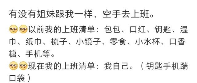 不背包出门的好处立竿见影:人走得更快,双手更自由,过安检不用卸包,挤地铁不再腾手,心情都轻松了几分。“我怎么没早点试试?”成了她们的共同心声。