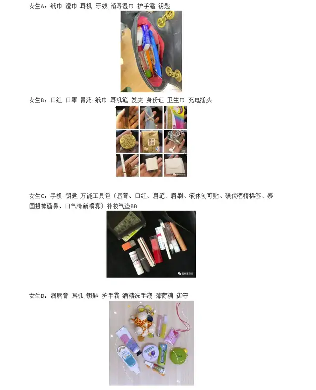 网友@末日白桃 统计了多位女性的随身物品,最终发现大家包里真正共有的,只有三样: