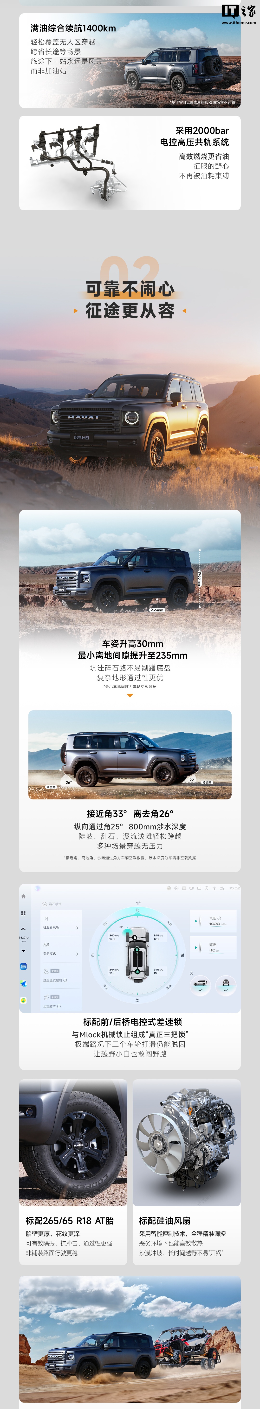 为满足越野穿越需求,哈弗 H9 穿越版在通过性方面进行了多项优化。车身高度较普通版提升 30 毫米,宽度增加 16 毫米,空载离去角达到 26 度,空载接近角从 31 度提升至 33 度,空载最小离地间隙提升 11 毫米至 235 毫米。此外,新车标配 AT 越野轮胎,配备双油箱,总容积为 131 升(78 升 +53 升),相比普通版哈弗 H9 柴油版的 78 升油箱容积,穿越版的续航能力显著增强。