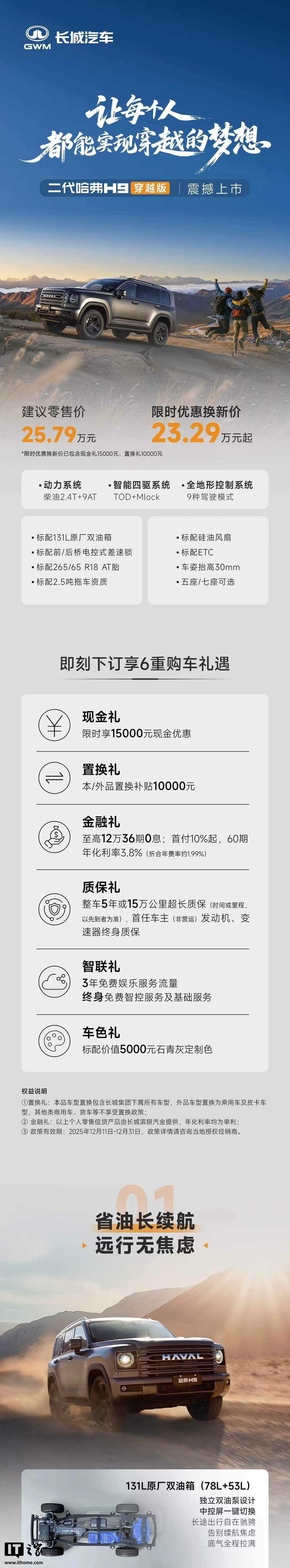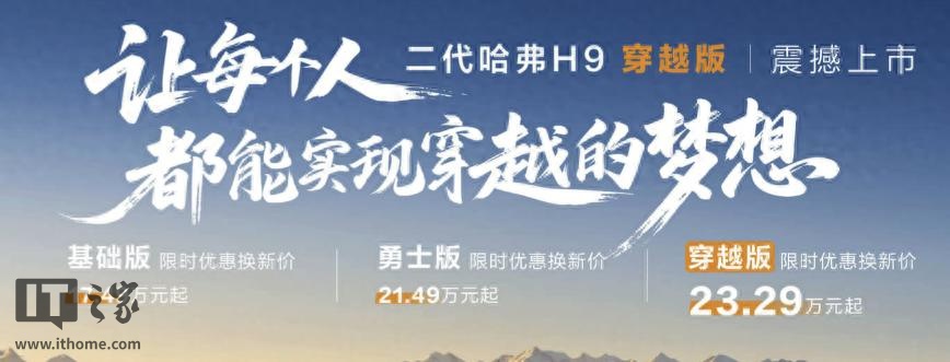 IT之家 12 月 11 日消息,长城汽车哈弗 H9 穿越版上市,官方指导价为 25.79 万元,限时焕新价 23.29 万元起,该车型专为越野穿越用途打造。