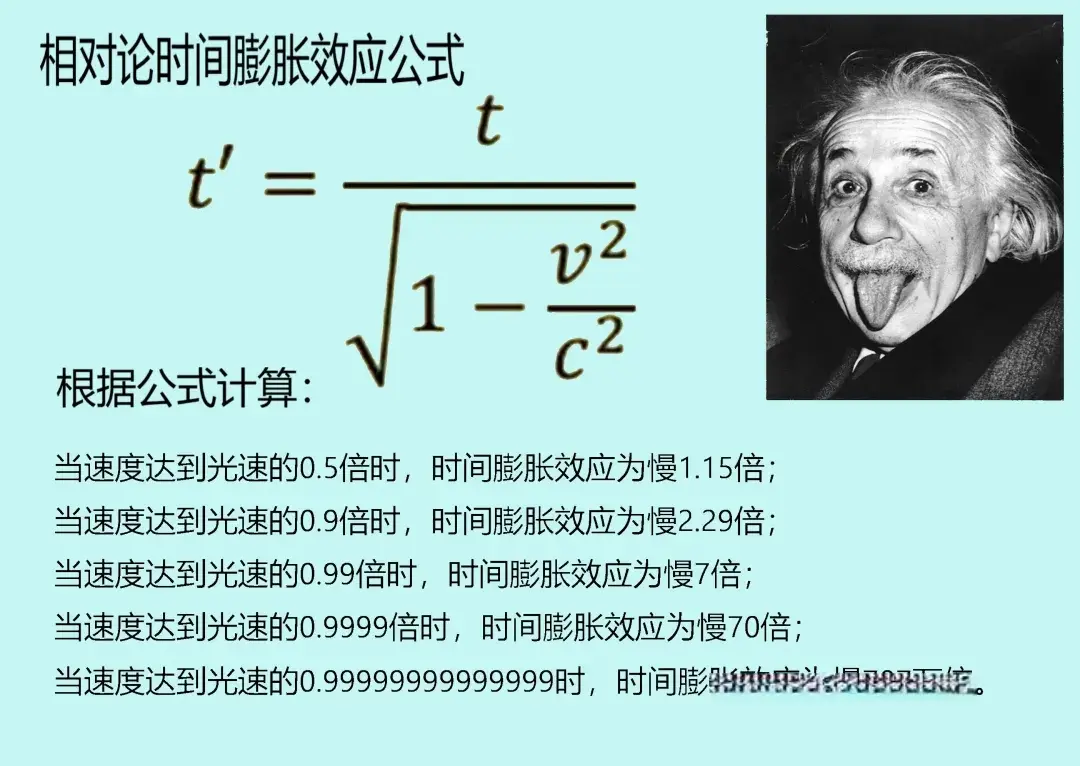 狭义相对论的核心是 “光速不变原理” 和 “相对性原理”,由此推导出速度时间膨胀—— 物体的运动速度越快,其自身的时间流逝就越慢。