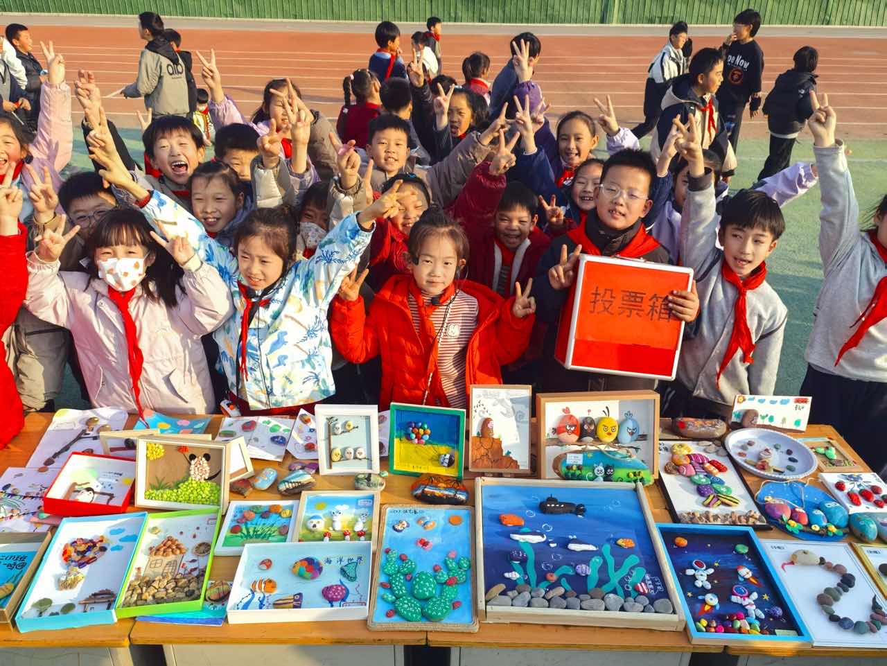 低学段学生以“变废为宝”为核心,用日常材料解锁创意可能:一年级学生巧用纸杯,通过剪、贴、画、拼打造出小动物、风车、小剧场等童趣作品,演绎“魔法纸杯”的无限可能;二年级学生依托天然石头的独特形态,勾勒出动物、卡通人物、风景等多样画面,让石头成为承载创意的“天然画布”;三年级学生在环保创作基础上融入机械动力知识,用纸盒、橡皮筋等材料制作出动力小车、杠杆投石机等作品,实现创意与科学原理的巧妙结合。