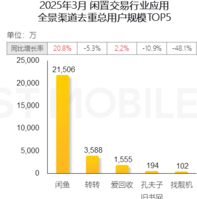 Questmobile 在其发布的《2025 中国移动互联网春季报告》中指出,截止今年 3 月,闲鱼用户总规模已超 2.1 亿,同比增长 20.8%。