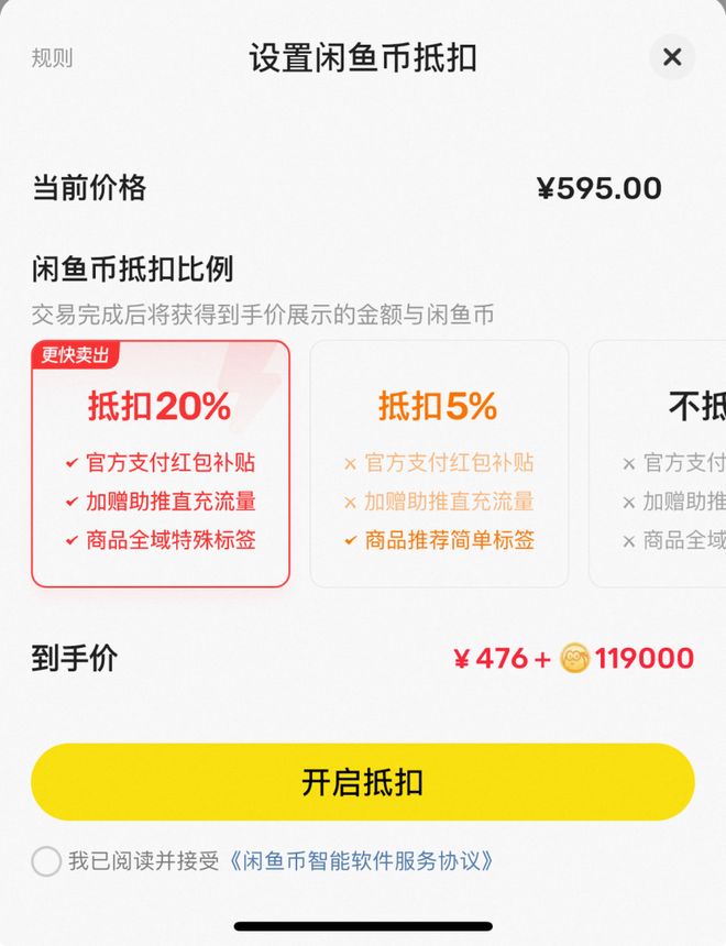以笔者为例,本该价值 595 元的商品,在选择闲鱼币优雅抵扣后,若商品售出,则只能收到 476 元。剩余的 119 元将以 119000 闲鱼币的形式发放到笔者闲鱼账户中。