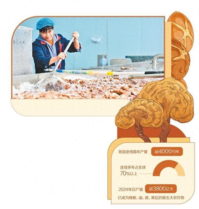数据显示,我国食用菌年产量超4000万吨,连续多年占全球70%以上,2024年总产值超3800亿元,已成为继粮、油、蔬、果后的第五大农作物。从种类看,已知的食药用菌有1000种以上,能够人工培养子实体的近80种,食用菌能商品化生产的近50种,药用和加工生产成保健食品的近30种。