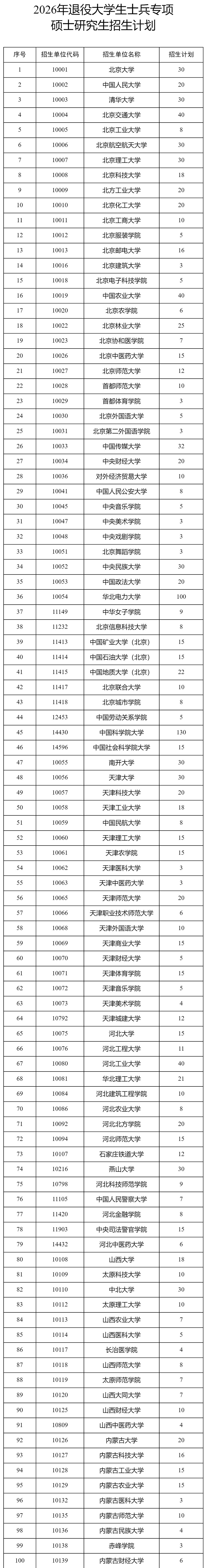 为鼓励高校学生参军入伍,拓宽退役大学生士兵成长成才通道,教育部近日印发通知,决定2026年继续实施退役大学生士兵专项硕士研究生招生计划。2026年全国“退役大学生士兵计划”由北京大学、清华大学等523所普通高等学校承担。一起看招生计划——