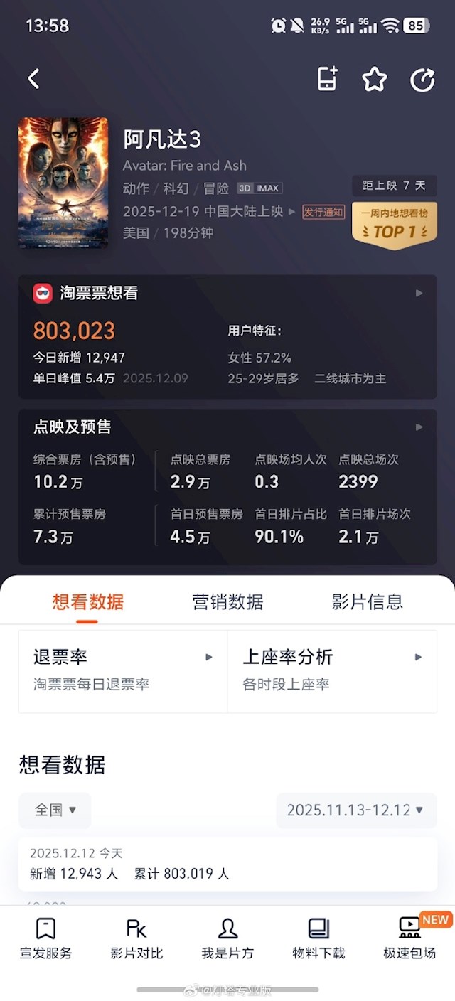 快科技12月12日消息,20世纪影业今日宣布,科幻大片《阿凡达3:火与烬》全国预售现已开启,电影将于12月19日全国上映。 12月17日18:00-12月18日,CINITY独家超前点映抢先来袭。 12月18日18:00起,超前点映全面开启。 据灯塔