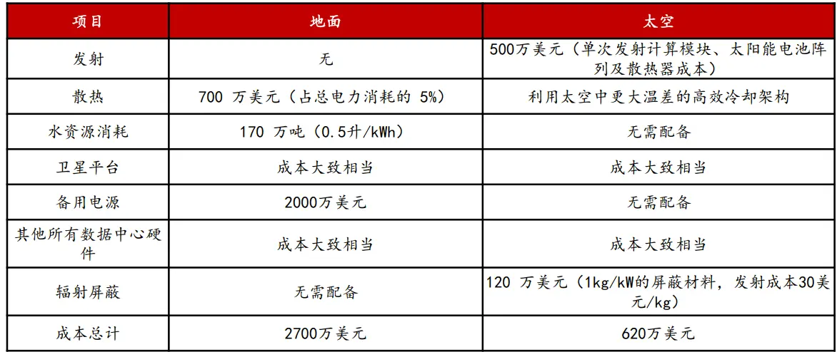 以40兆瓦集群运营10年为目标,如果采用传统数据中心,10年运营成本约1.67亿美元,其中能源消耗高达1.4亿美元,光冷却费用就要高达700万美元。而要完成同样的目标,采用太空算力的总支出预计只有820万美元。成本差距显著。