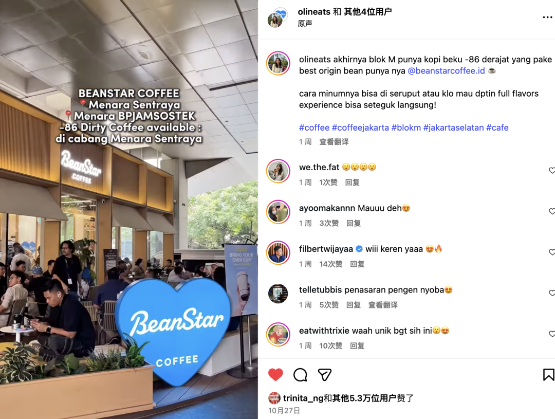 比如今年夏天在国内爆火的-86℃ Dirty,比星将其搬到东南亚,根据当地人的口味偏好调整上线,当月就引爆海外主流社媒Ins,单条种草视频曝光200万+,单店每日卖出100+杯,带动品牌成功出圈。