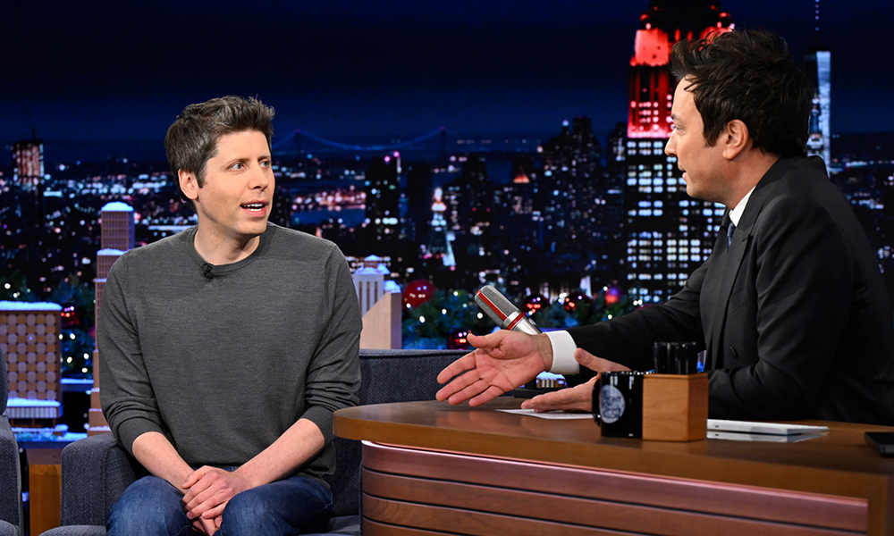 萨姆·奥尔特曼(Sam Altman,左)在《今夜秀》节目中向吉米·法伦(Jimmy Fallon)坦言,随着人工智能重塑就业、教育及全球经济格局,ChatGPT崛起速度之快,着实令人不安。图片来源:Todd Owyoung/NBC via Getty Images