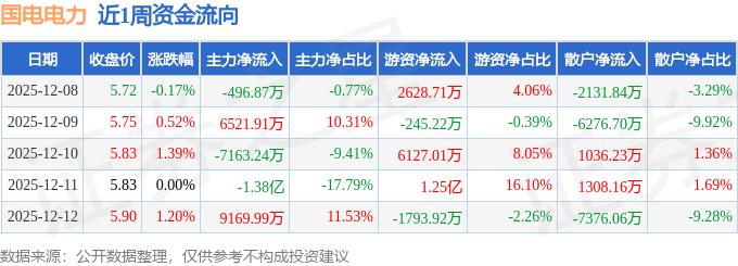 本周盘点(12.8-12.12):国电电力周涨2.97%,主力资金合计净流出5759.63万元