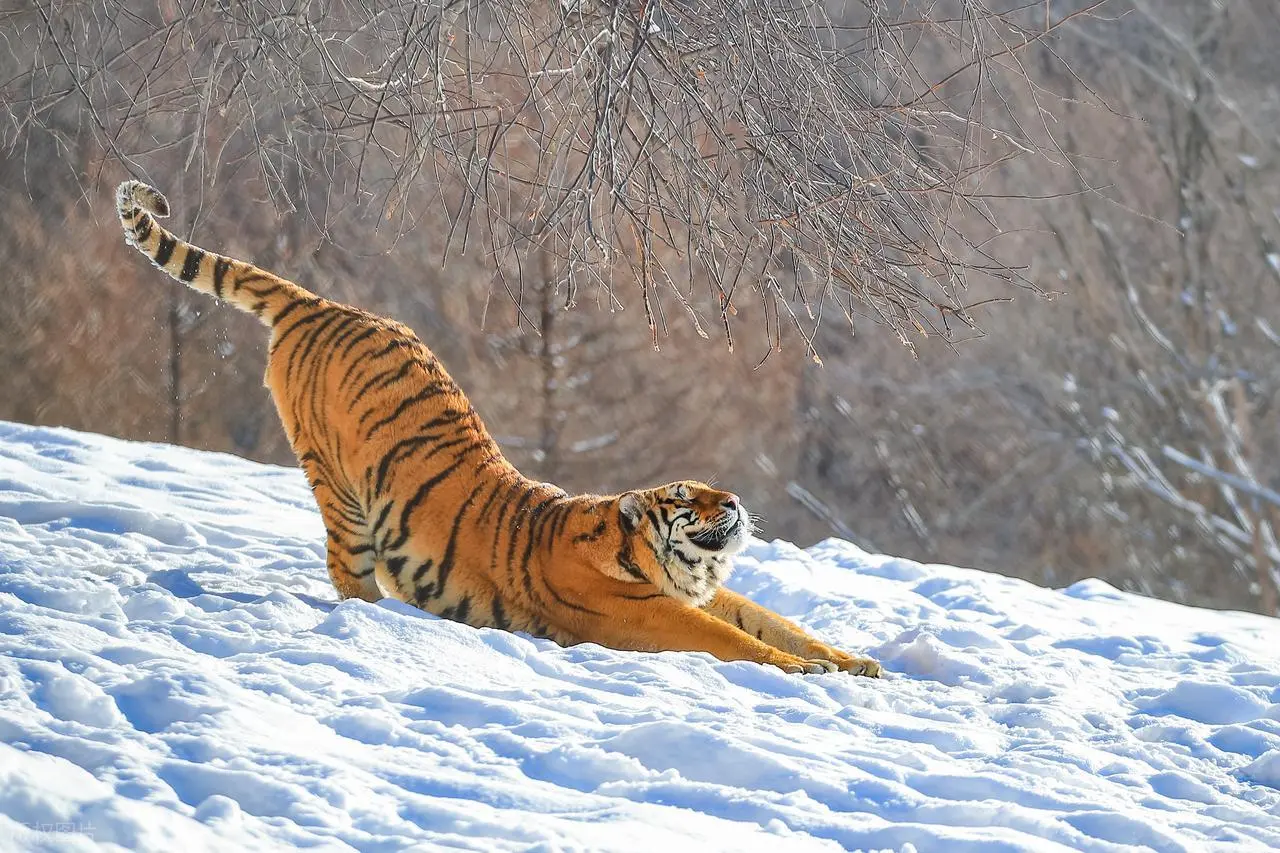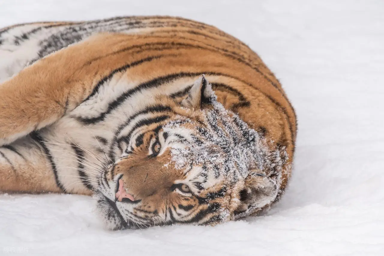 最令人惊叹的是它们的“雪窝策略”,老虎卧下时体温会融化表层积雪,形成浅坑后反而获得保温效果:下层未融化的雪如同隔热床垫,上方蓬松的积雪则成为天然棉被。