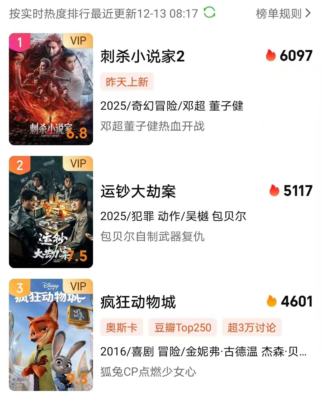 前不久,由邓超主演的《刺杀小说家2》正式登陆各大电影平台。它并没有在第一时间直接登顶热度榜的榜首,而是随着几个小时的不断发酵,该片才成功打败《运钞大劫案》,中断了它的热度冠军之路。