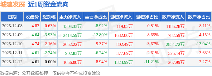 本周盘点(12.8-12.12):城建发展周跌3.96%,主力资金合计净流出1513.53万元