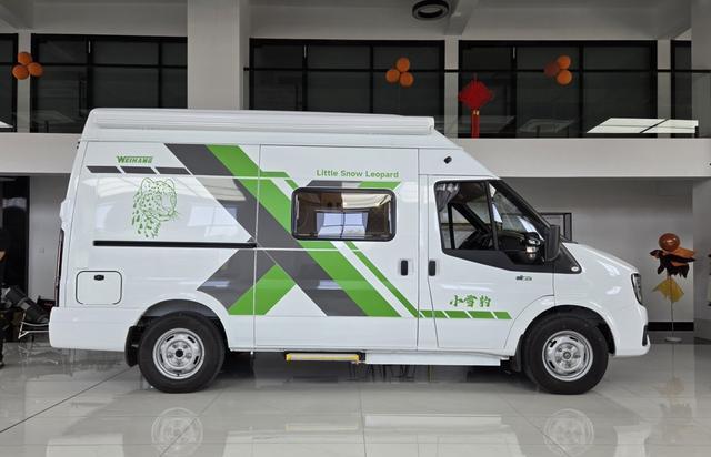 其车身尺寸为5495×1974×2620mm,轴距3360mm,整体造型紧凑且灵动。外部配置上,它配备了房车专用双层真空亚克力外推窗带纱窗,左、右、后2个横床设计的外推窗保证了良好的通风与采光;3米户外遮阳棚(配备晾衣扣10个、户外照明灯带),为户外生活提供了舒适的拓展空间;外置厨房采用柴油灶并安装在尾部,方便户外烹饪;此外,还配有电动侧踏步,方便上下车;车身彩贴“雪豹”增添了独特的个性标识。