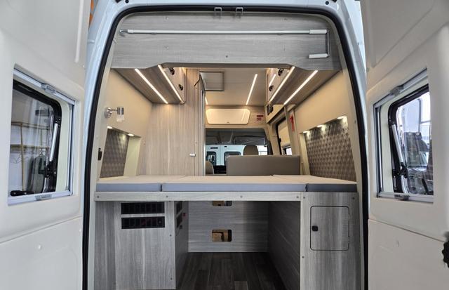 睡卧区横置双人床,搭配高密度海绵床垫,为使用者提供了舒适的睡眠环境。床的尺寸设计合理,能够满足两人的休息需求,让旅途中的疲惫得以充分缓解。