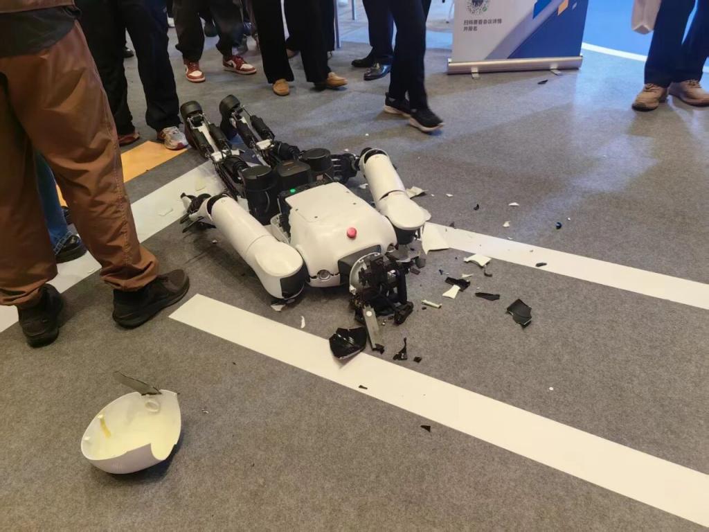 正当竞赛如火如荼,“嘭”的一声,一台正在测试行走能力的人形机器人重重摔倒在地,脑袋外壳瞬间碎裂,零件散落一地。