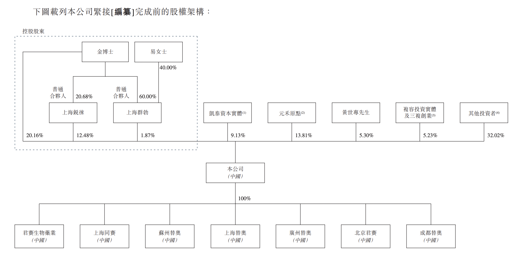上海群勃为一家有限合伙企业,由金华君(作为其唯一普通合伙人)及易中梅(金华君配偶,作为其有限合伙人)分别拥有60%及40%权益。公司的雇员激励平台上海锐徕为一家由金华君(作为其唯一普通合伙人,持有其约20.68%合伙权益)管理及控制的有限合伙企业。