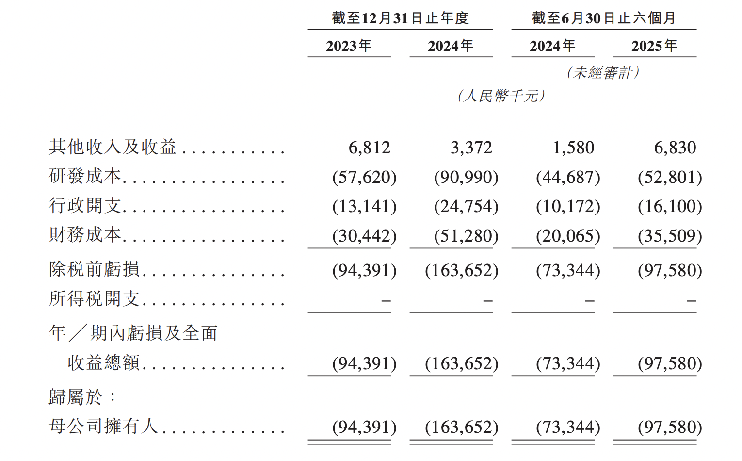 君赛生物目前并无获批准商业销售的产品,并于往绩记录期间录得亏损。2023年、2024年、2025年上半年,君赛生物其他收入及收益分别为681.2万元、337.2万元及683万元;研发成本分别为5762万元、9099万元、5280.1万元;年╱期内亏损及全面收益总额分别为9439.1万元、1.64亿元、9758万元。