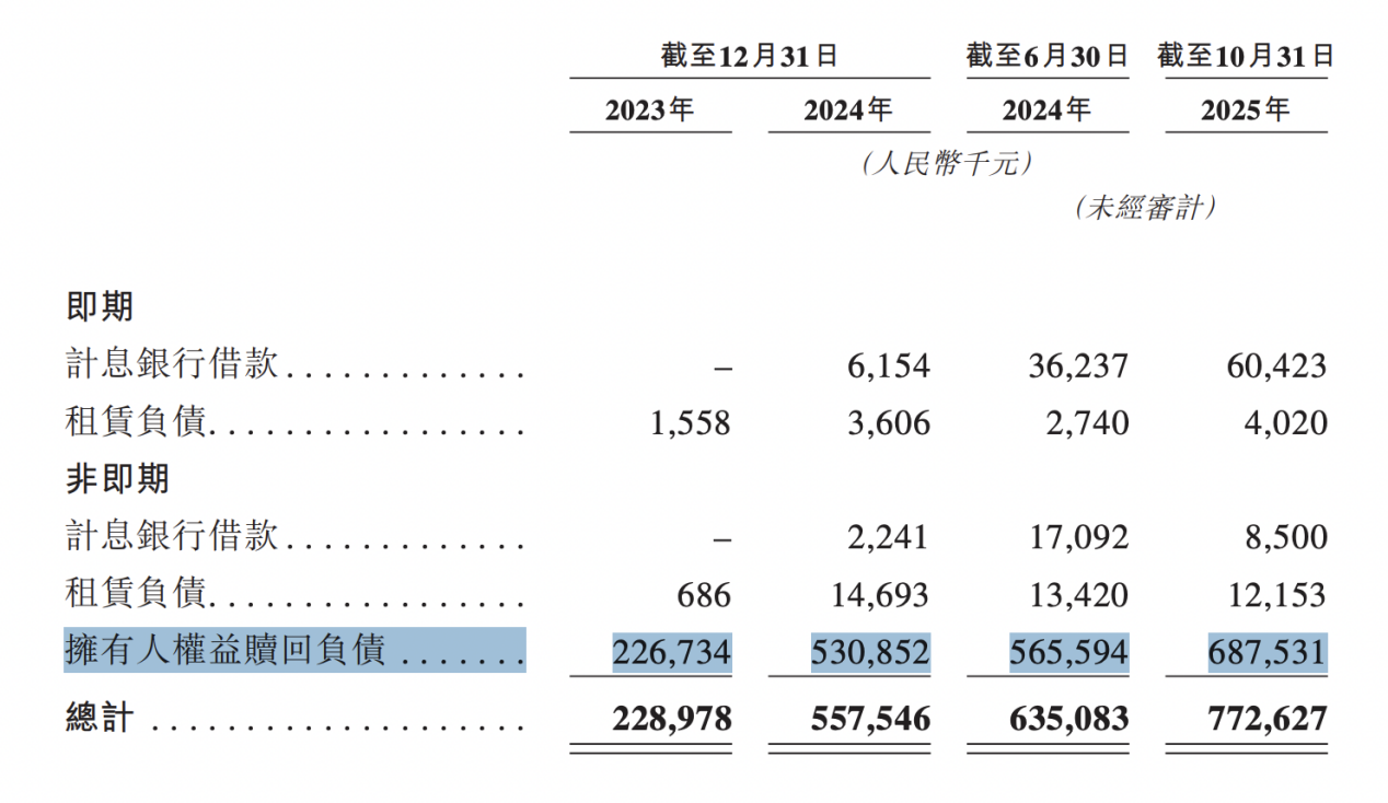 不可忽视还有,君赛生物的拥有人权益赎回负债持续攀升,主要为公司融资活动发行的普通股所附带的回购义务。2023年末、2024年末及2025年10月末,公司拥有人权益赎回负债分别为2.27亿元、5.31亿元、6.88亿元。
