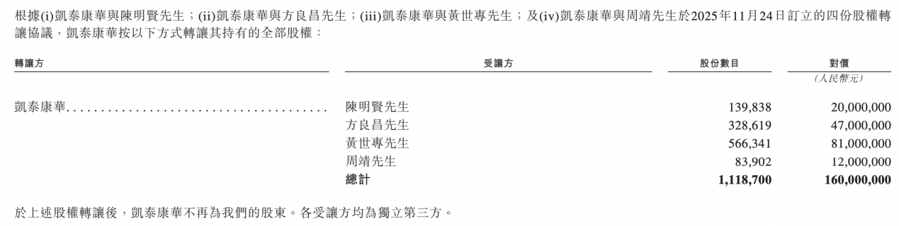值得注意的是,2025年11月24日,凯泰康华与陈明贤、方良昌、黄世专、周靖分别订立了四份股权转让协议。据此,凯泰康华按向陈明贤、方良昌、黄世专、周靖合计转让111.87万股股份,交易对价1.6亿元。股权转让后,凯泰康华不再为君赛生物的股东。