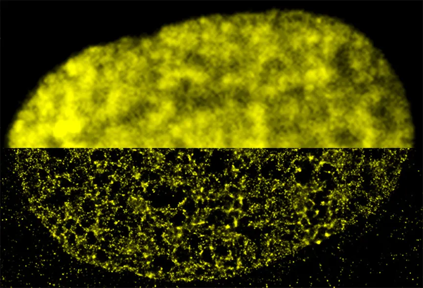 在成纤维细胞的细胞核内,一种名为H2B的DNA结合组蛋白被荧光标记为黄色。图像的上半部分是用常规宽场荧光显微技术拍摄的;下半部分则是用超分辨率显微技术拍摄的。图片来源:M.A. Ricci 等/《细胞》(Cell)2015。