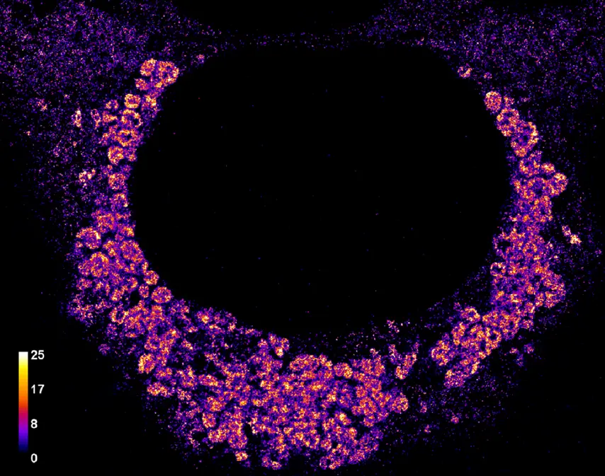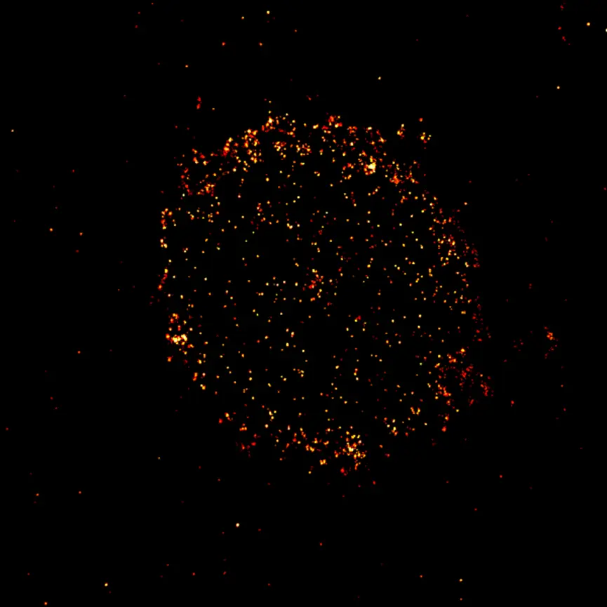 一种新的显微技术能够点亮癌细胞表面的CD19蛋白。图中展示了多发性骨髓瘤患者细胞上的这种蛋白,检测它有助于确定哪些患者能从靶向CD19的疗法中受益。图片来源: 马库斯·萨奥尔(Markus Sauer)。