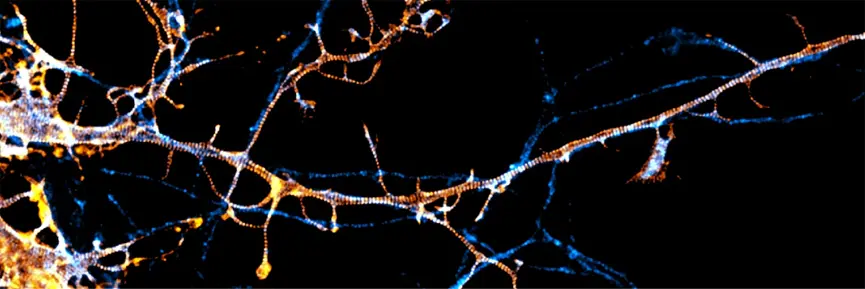 专门的显微技术揭示了神经细胞具有一种特殊的内部骨架,称为“膜相关周期性骨架”。这种高度有序的纳米结构骨架受到一种名为 paralemmin-1的蛋白质调控(图中显示的荧光标记部分)。图片来源: 维克多·马卡龙-帕拉西奥斯(Victor Macarrón-Palacios)/ 马克斯·普朗克医学研究所(Max Planck Institute for Medical Research)。