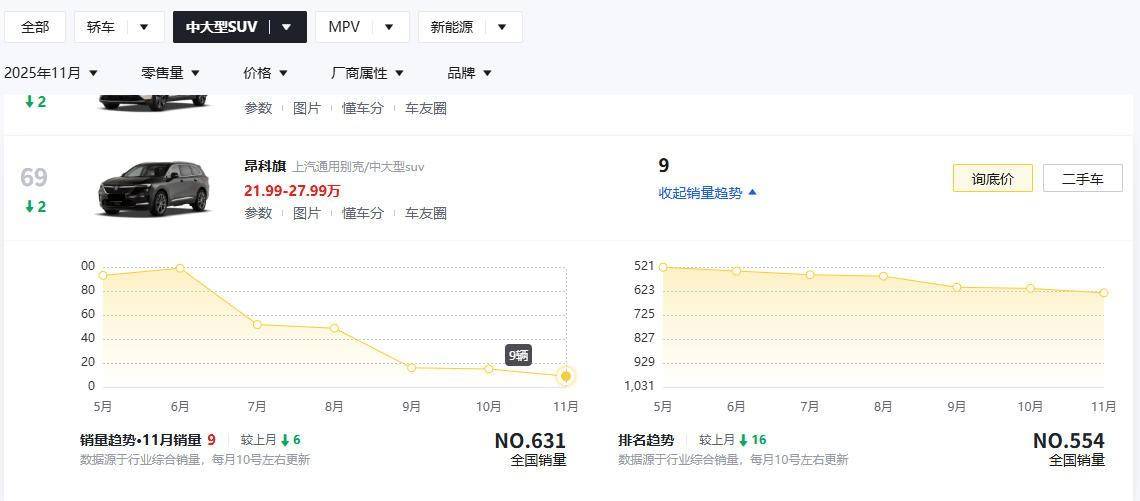 兄弟们,说出来你们可能都不信,别克昂科旗在11月份的销量数据居然只有9辆新车。而且即便是再往前推半年,昂科旗每月的销量数据也不过才区区十几到几十台,这是让我们所没有想到的。要知道,以前这车可是能月销上千台的,可现在却变成了一个月销个位数、且连续多月销量下滑的销量表现,那这又是为何呢?为啥别克昂科旗这车没人想买了呢?我们来简单分析分析。