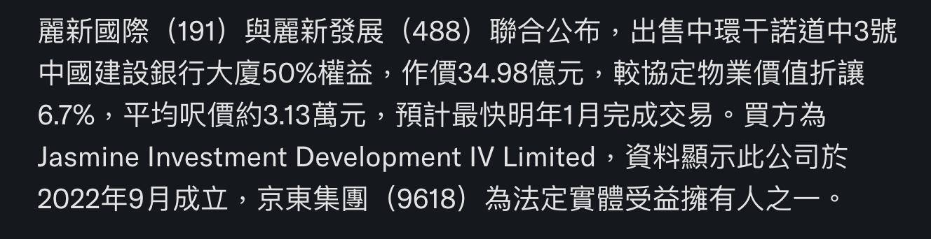 林建岳旗下集团所持有的中国建设银行大厦位于中环干诺道3号,丽新发展持有一半的业权,另一半的业权在建设银行手上。丽新发展自从上半年传出了财困问题后,要出售该物业五成权益的传闻此起彼伏,而买家也各有不同,林建岳对此一直不置可否,如今也总算一锤定音,买家为内地企业京东。丽新发展最新发布的通告称,出售的协定价为34.98亿,在出售这个大厦的业权,并且偿还相关贷款后,将会套现24亿的现金,这大大缓解了负债压力。