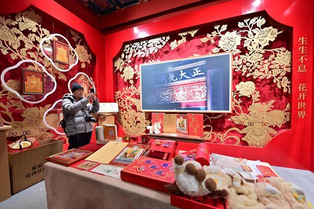 20余款故宫年货摆满两张桌子。生肖贺岁邮票、各个版本的故宫日历和故宫福筒等经典款产品依旧吸引观众目光。观众龚女士说:“样式虽然是老搭配,但上面的内容每年都有新惊喜,即便是‘过季’了,也值得收藏。我很喜欢今年的年画,源自明代的《柳荫双骏轴》,柳叶桃枝下的两匹白色骏马非常有生机。手机扫码还能在福字上获取动画效果,看到骏马从紫禁城奔腾而出。”