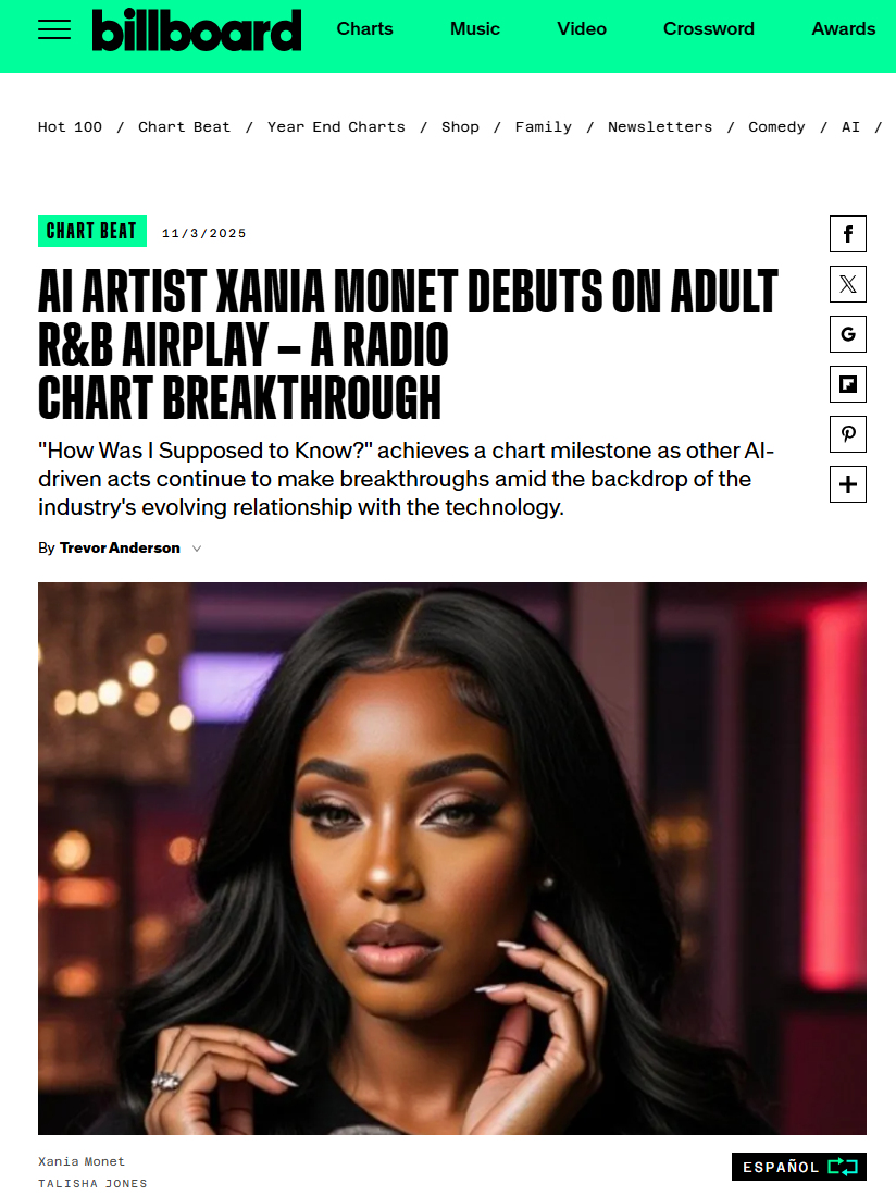 以音乐流媒体平台Spotify为例,Spotify Viral 50,即全球飙升榜前50名,在2025年11月内多次出现AI音乐,其中热门的《Walk My Walk》播放量超过640万。由美国诗人泰莉莎(Telisha Nikki Jones)利用AI音乐生成平台Suno创造的虚拟歌手Xania Monet,在Spotify上拥有超过120万听众,其热门曲目《How Was I Supposed to Know?》登上了美国知名音乐榜单Billboard。