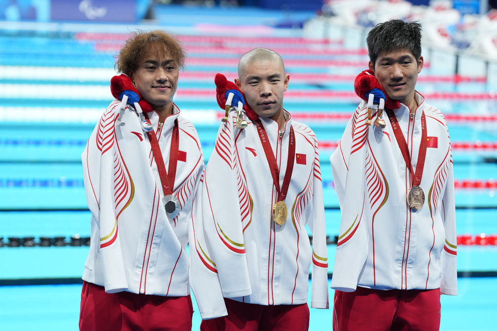 2024年9月6日,在巴黎残奥会游泳男子50米蝶泳S5级决赛中,中国选手郭金城(中)、袁伟译(左)、王李超包揽该项目冠亚季军。新华社记者 熊琦 摄